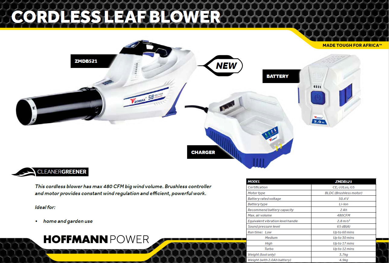 This cordless blower has max 480 CFM big wind volume. Brushless controller and motor provides constant wind regulation and efficient, powerful work.